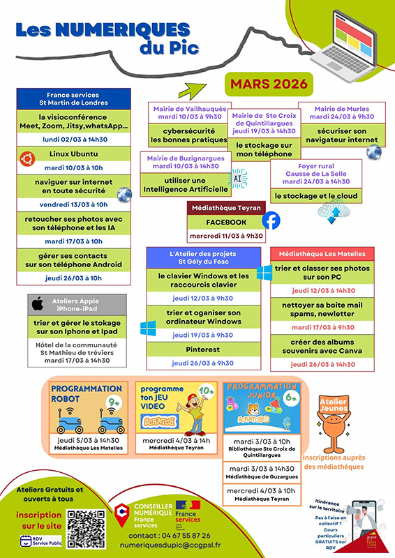 Ci-contre le programme des ateliers numériques proposés par Les Numériques du Pic pour le mois de Mars 2026.